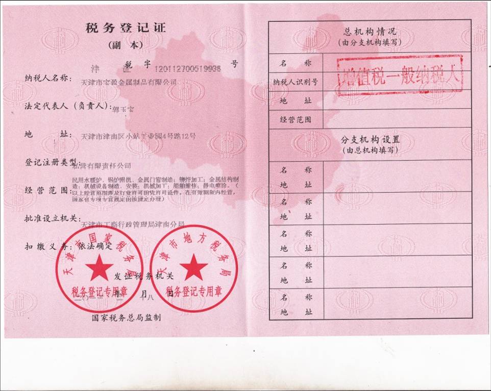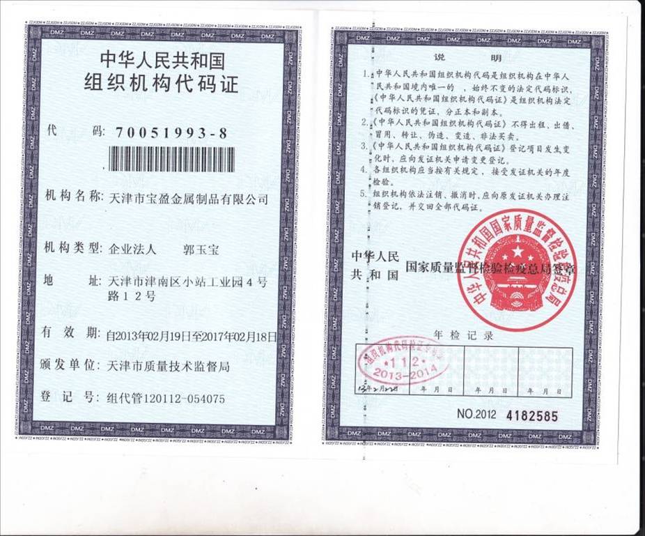 天津市寶盈金屬制品有限公司成立于1998年,公司坐落于天津市津南區小站工業園。距津港高速公路2公里,塘沽港25公里,天津濱海國際機場25公里,海、陸、空交通十分便利。公司占地面積10000平方米,年生產能力4500噸金屬制品,包括辦公室人員及車間工人寶盈共有100多名員工。 2010年6月2日,通過了ISO9001:2008質量管理體系認證,2012年5月由摩迪國際進行焊工考試,取得EN 287-1焊工資格證書。